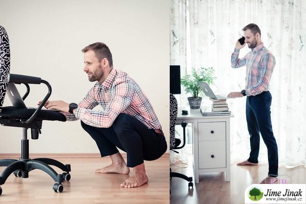 Doporučuji střídat během práce na počítači různé polohy – kromě sedavé polohy (monitor v úrovni očí, rovná záda, podložka pod zadek apod.). Je super vzít občas notebook někam jinam a zkusit alespoň pár minut pracovat ve stoje (existují výškově nastavitelné stoly, ale postačí i skříň apod.) nebo ho dát třeba na zem nebo židli a dřepnout si k němu – hluboký dřep je velmi komplexní a zdravý cvik, ve které bychom měli denně trávit mnoho minut času – časem se nám zlepší mobilita a vydržíme tam mnohem déle :-)