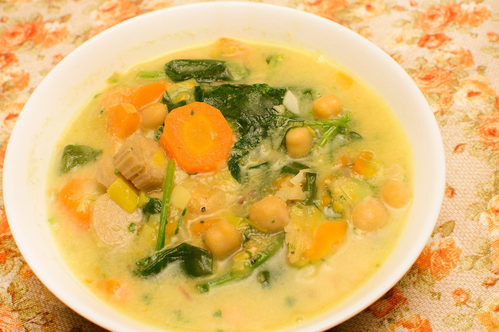 - Přidejte cizrnu, kokosové mléko, špenát, osolte, opepřete a vařte dalších 10 minut.