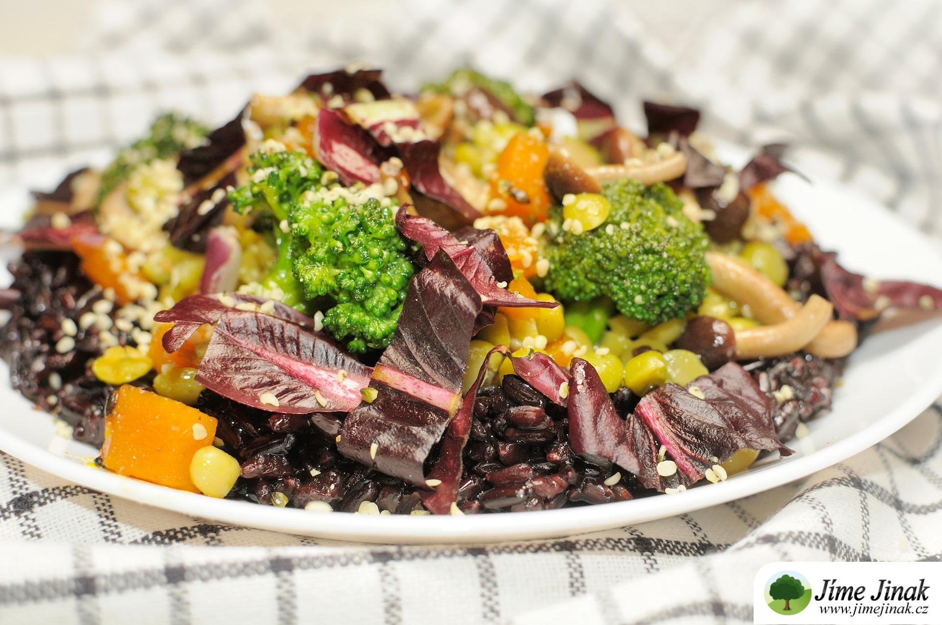 - Uvařenou rýži podávejte ochucenou olivovým olejem a solí, přidejte vše ostatní a posypejte konopnými semínky a červenou čekankou.
