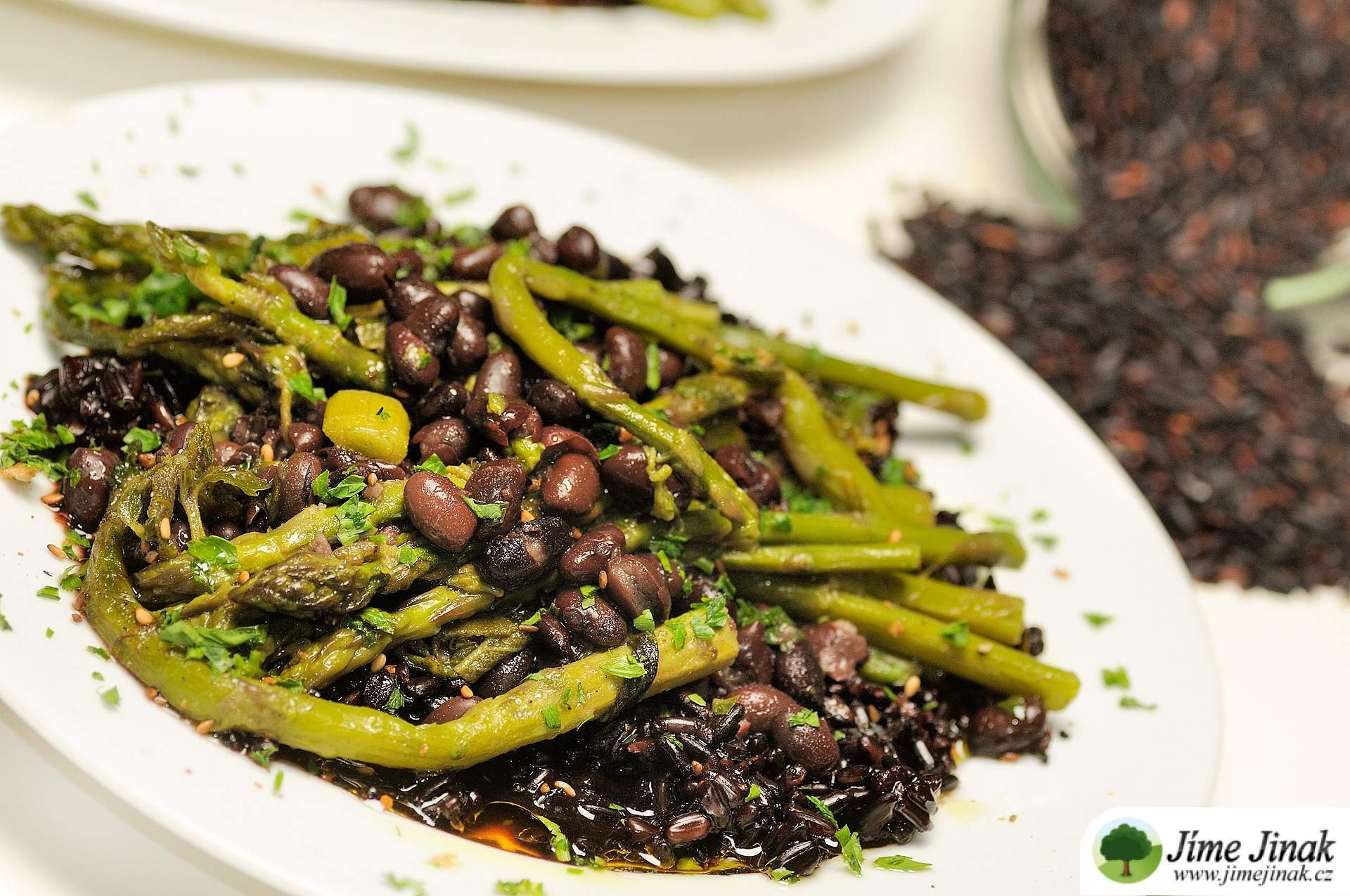 8. Na talíř naservírujte fazole s rýží a navrch dejte chřest s bylinkami. Pokapejte citrónovou šťávou a posypejte gomasiem.