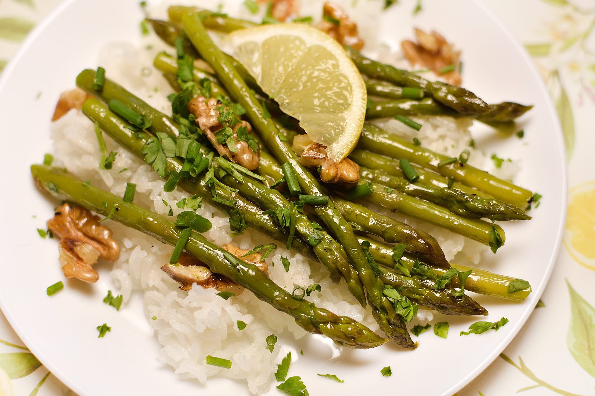 - Na talíř dejte rýži, chřest, posypejte petrželkou a pažitkou.