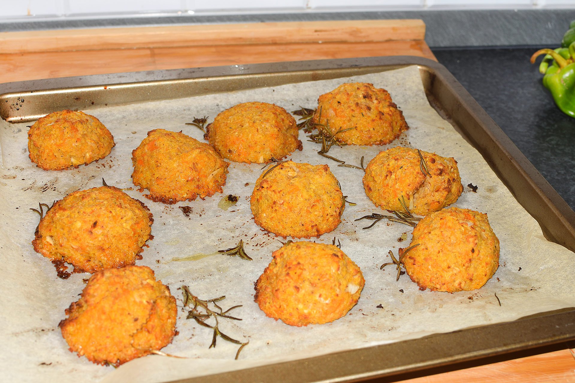 - Rukou pomaštěnou olejem dělejte hromádky na plech pokrytý pečicím papírem, který potřete olejem. Hromádky pokapejte olejem a dejte trochu rozmarýnu kvůli vůni.