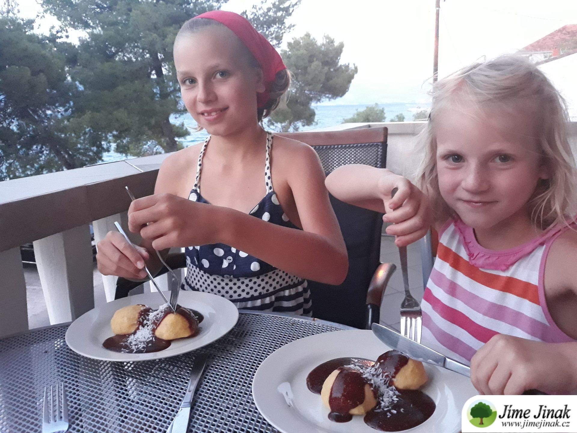 Při dalších cestách mezi lidi narážíme na nové lákadlo. Palačinky. Holky je zbožňují a doma je dělá zásadně Roman. Mě je nebaví dělat a vlastně ani moc jíst. Já bych je jedla na slano, oni na sladko, já to nerada vidím, takže palačinky dělá Roman, když nejsem doma. Už už jsme je málem holkám koupili, když se Roman nabídl, že je klidně udělá. Fakt je, že za cenu dvou palačinek na kolonádě můžeme mít palačinek doma nepočítaně. A jak řekl, tak udělal. A mě chytla chuť na tvaroh, tak jsme to spojili. Roman udělal palačinky ze špaldové mouky, kterou jsme sehnali v DM drogerii v Trogiru, já udělala “tvaroh”. Dokonce dvoubarevný – část jsem obarvila kakaem. To vám byli zase orgie. Ovšem Evča si dala jen se zeleninou, což byla naše večeře.