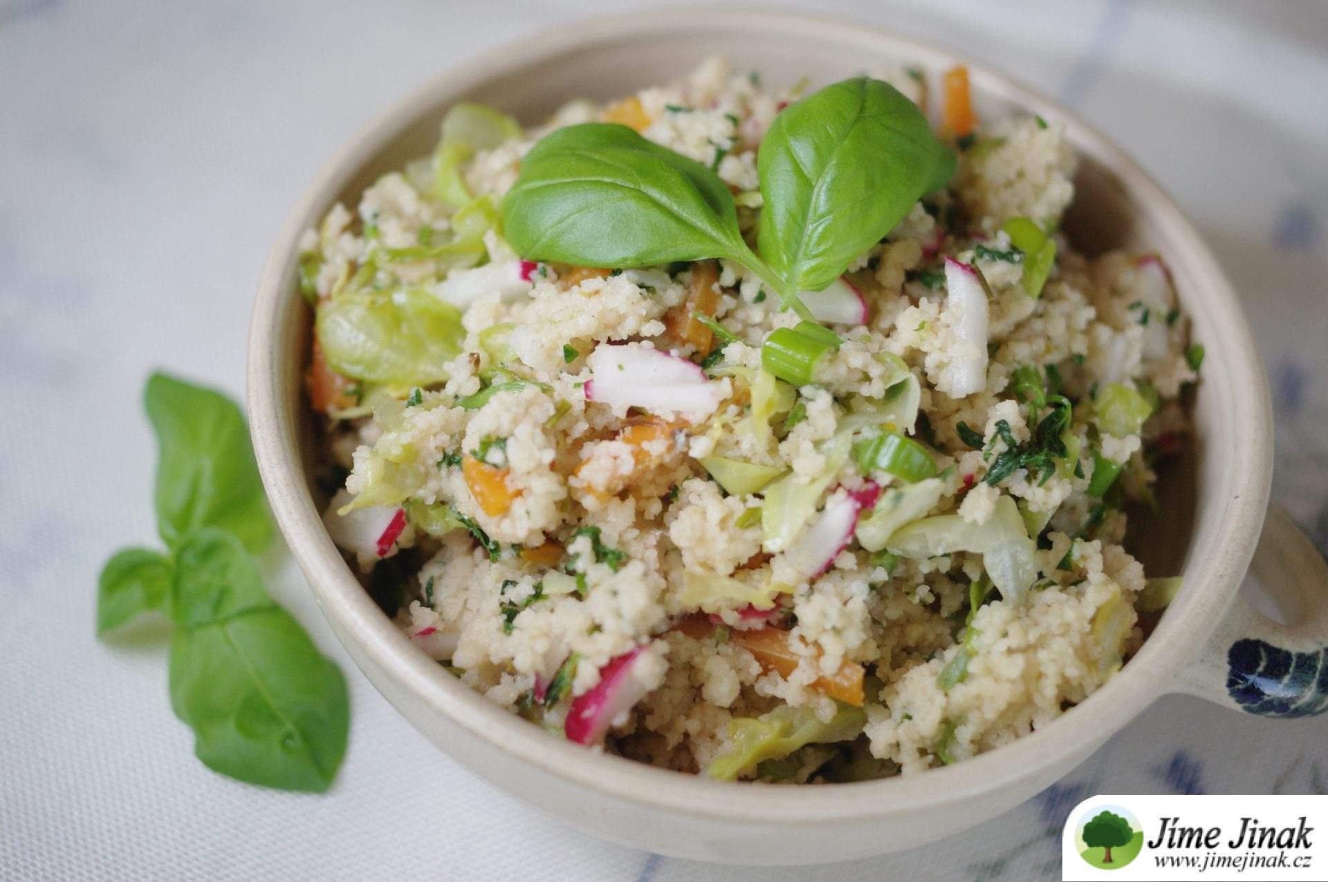 - Do hotové zeleninové směsi přidáme vařený kuskus, ředkvičky, zelenou část jarní cibulky, šťávu z citrónu a promícháme.