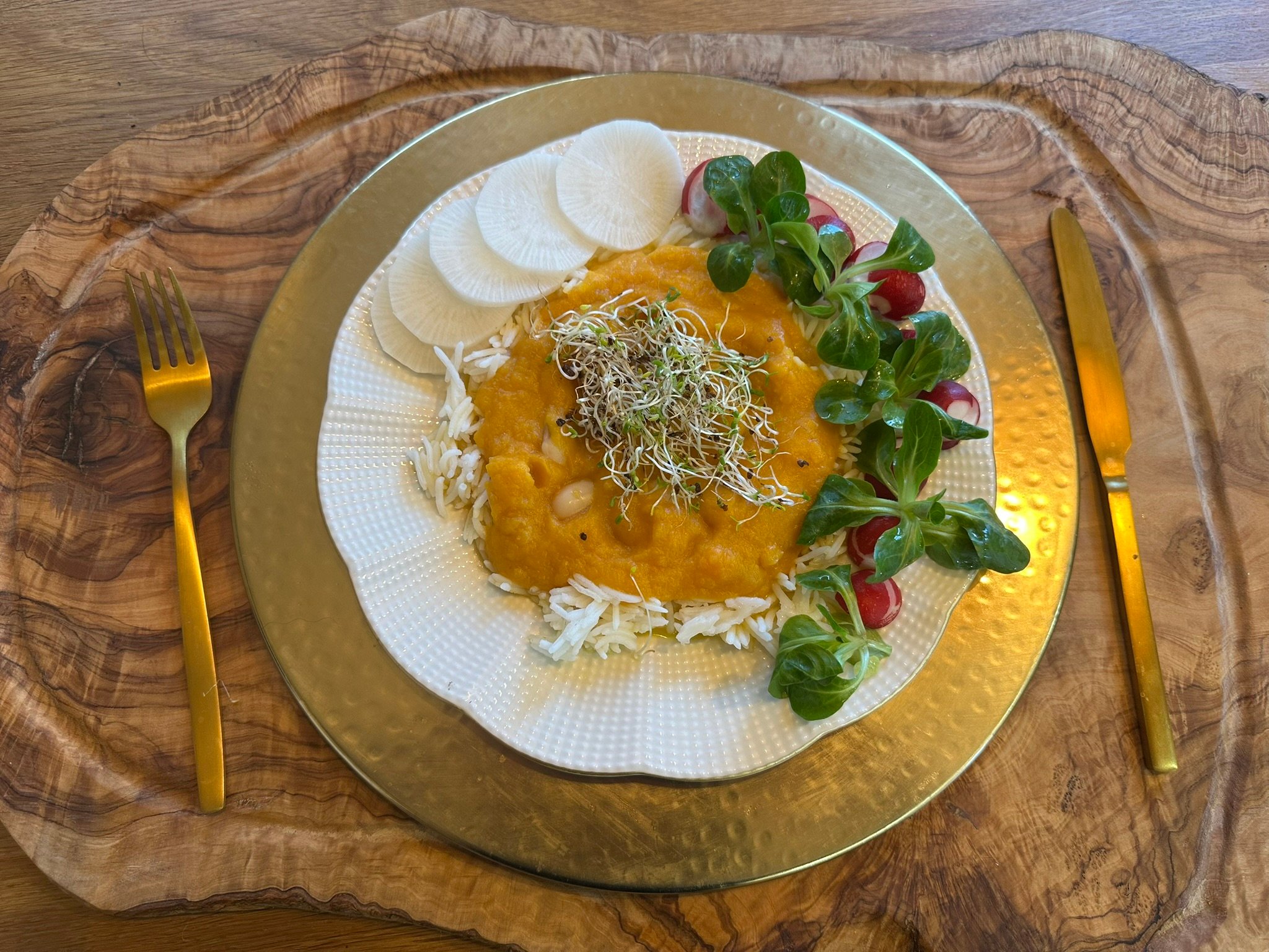 Jaro je obdobím odlehčení a nového začátku. Tělo přirozeně touží po lehčích jídlech, která zahřejí, ale zároveň přinesou svěžest. Sladká chuť mrkve a dýně jemně harmonizuje, bílá fazole dodá přirozenou sytost a čerstvá zeleninová obloha celý talíř projasní a odlehčí. Teplý základ v kombinaci se syrovou jarní zeleninou vytváří vyvážený pokrm, který podpoří trávení a dodá energii bez pocitu těžkosti.