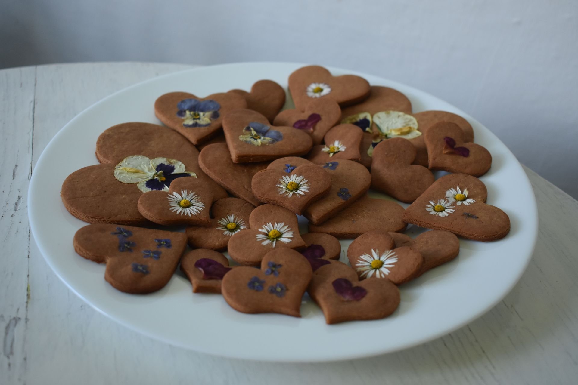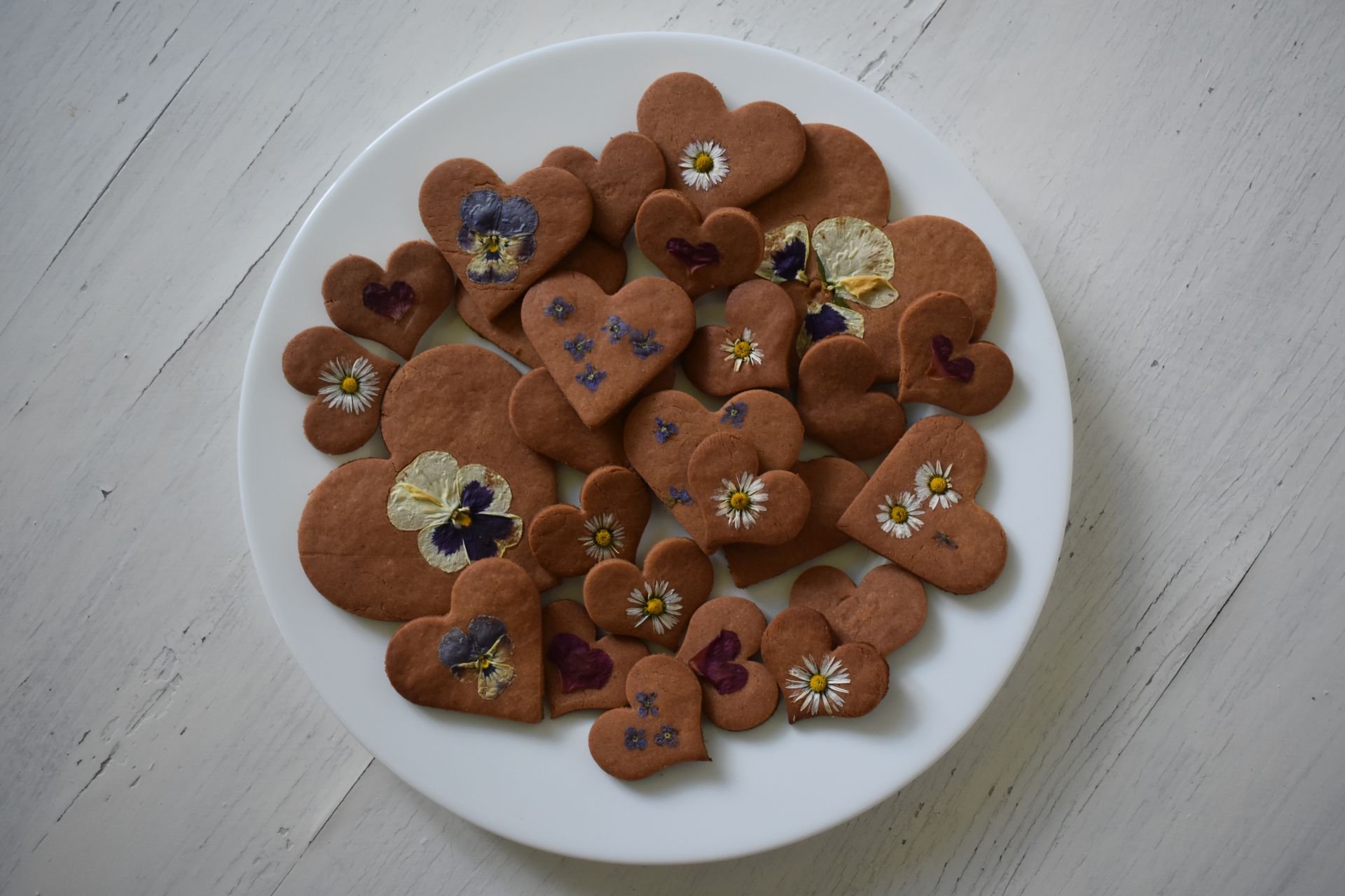 Sušenky jsou zdobené květy macešek, rozrazilu, sedmikrásky a srdíčky z lístků růže stolisté.