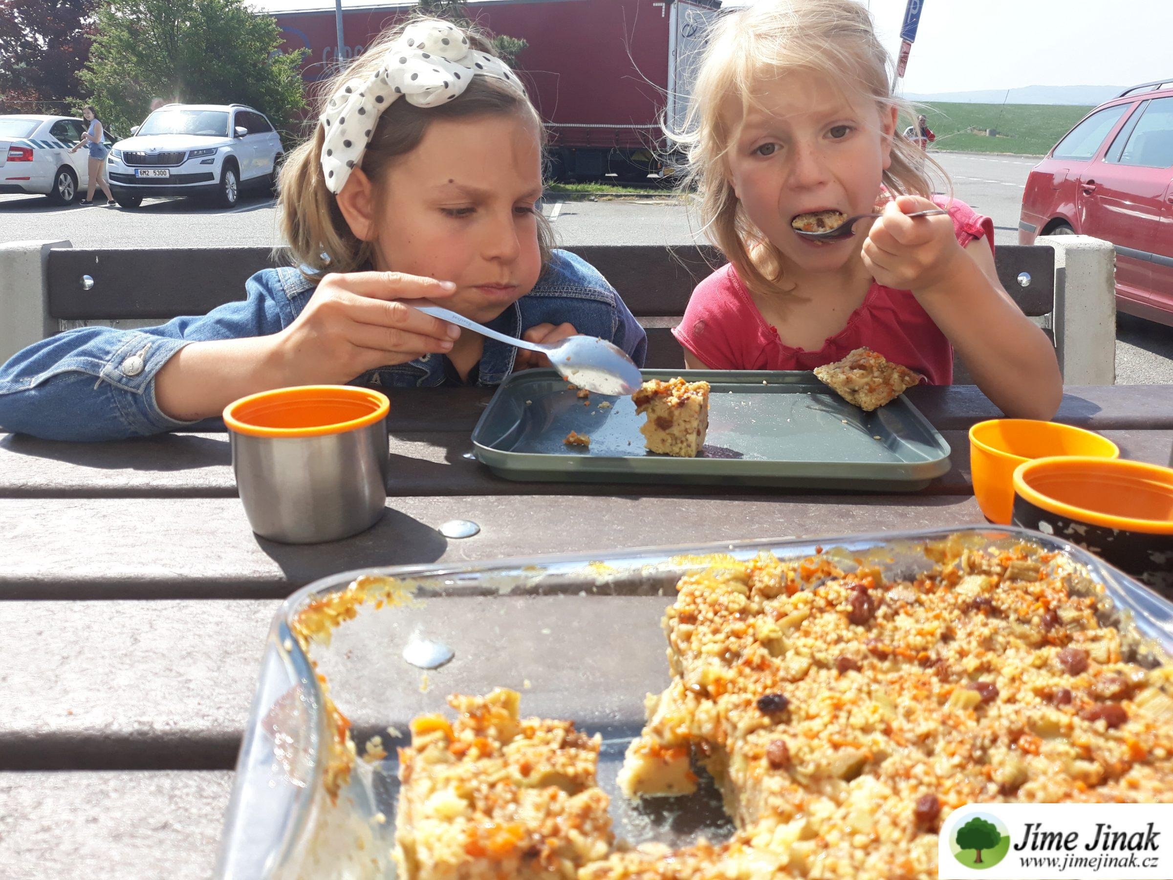 Sice jak kluci dostali sladké, hned se obracely na mě, zda taky něco mám, ale na to já jsem vždycky připravená. Když jsou akce s kamarády, co nejedí jako my, mám vždycky v zásobě jablka nebo jiné ovoce, sušené ovoce a oříšky, nebo nějaké zdravější mlsání buď z domova nebo z obchodu. Na tuhle akci jsem udělala reveňovou bublaninu, takže dvě svačiny byly vyřešeny velmi jednoduše. Navíc byly docela syté, takže holky ani hned neotravovaly s něčím dalším. Roman nám také na cestu upekl skvělý kváskový chléb, takže pro naše děti to byly skutečné hody od začátku do konce.