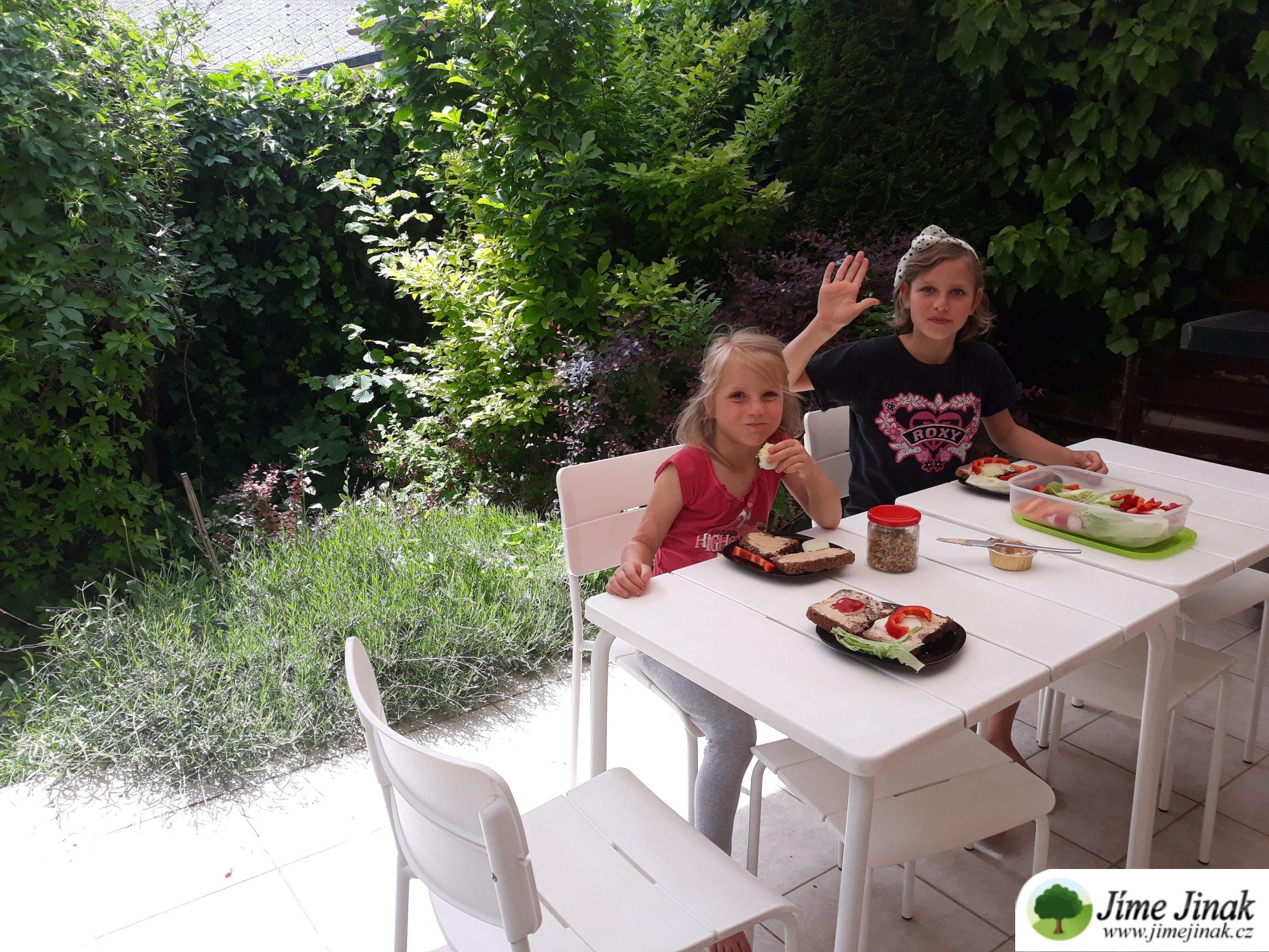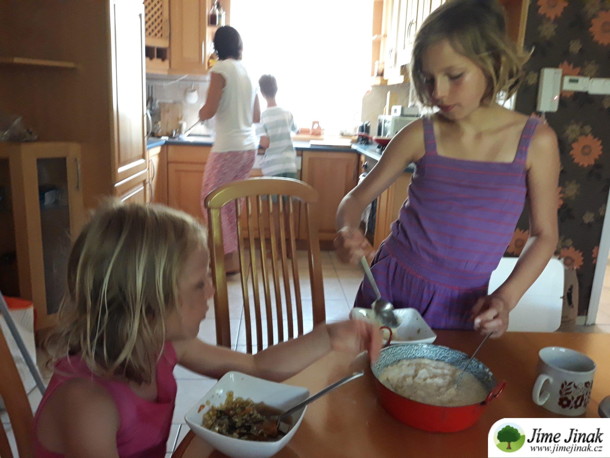 Helčiny kluky ovlivnila školka, škola a hlavně tatínkův přístup. Když mají jiné jídlo, trpí, respektive spíš ho prostě nejedí. Takže ti našim holkám rozhodně nic nezáviděli a dokonce si odmítli dát čerstvou čočkovou polévku, co jsem pro všechny navařila večer v den příjezdu. Naše holky jsou zvyklé, že jíme jinak a zatím s tím nemají žádný problém. Takže všem třem klukům nezáviděly ani chleba se šunkou, ani vajíčka, ani jogurty, ani sušenky. Jako jindy jedly jídlo, co jsem připravila, Markétka už mi i zdatně pomáhala v kuchyni.