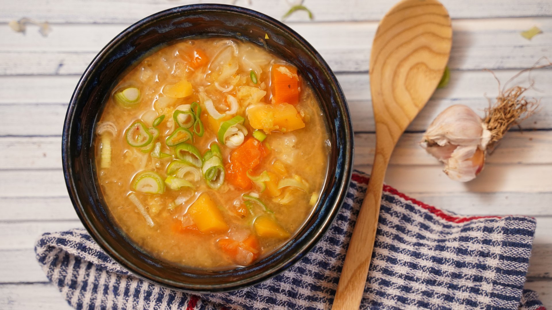 - Vyndáme sítko s kořením, dochutíme bílou miso pastou a podáváme sypané jarní cibulkou.