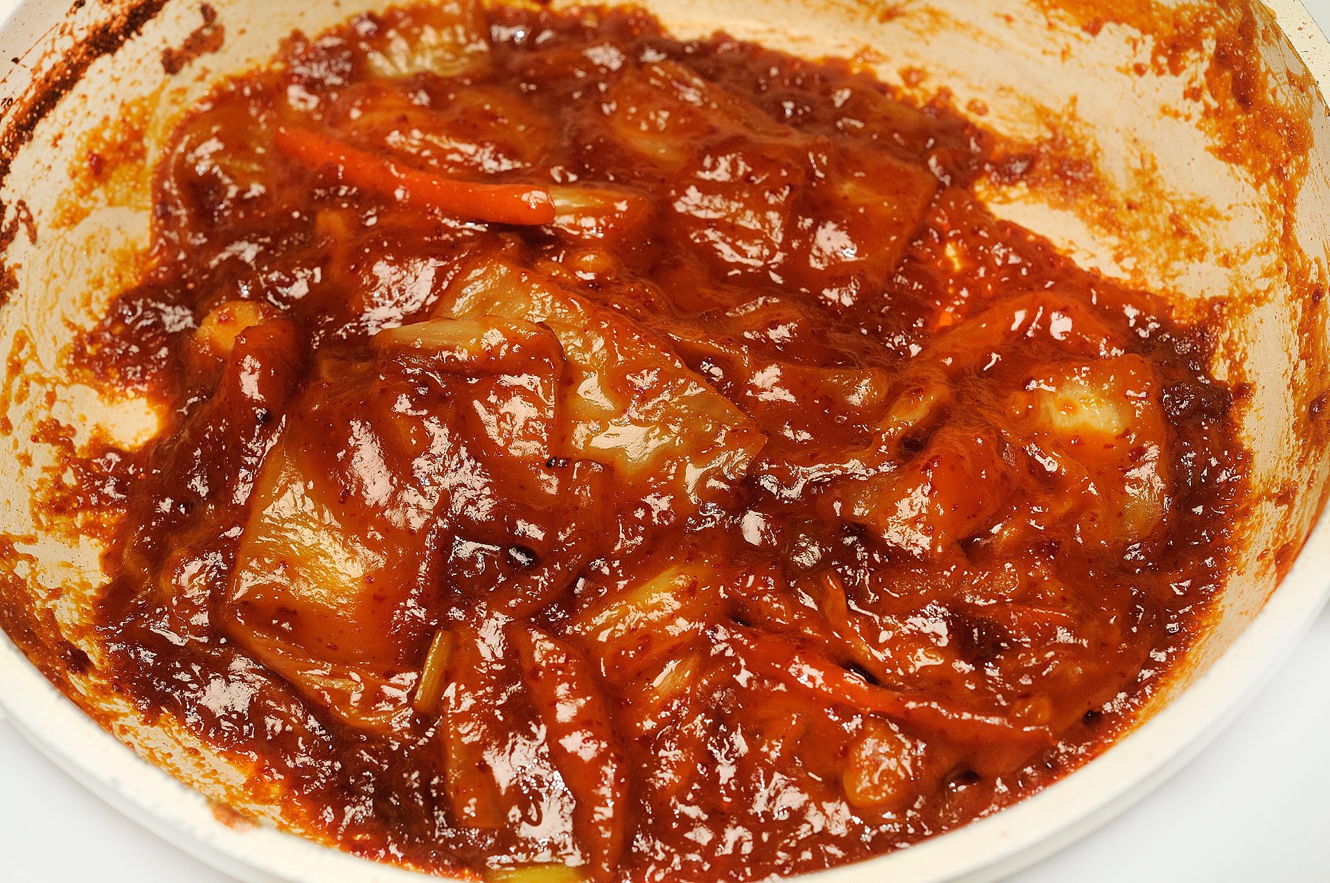 - Všechny ingredience na karamelizované kimchi dejte na pánev. Vše promíchejte a pomalu vařte, dokud omáčka neztmavne a nezhoustne. Dejte stranou