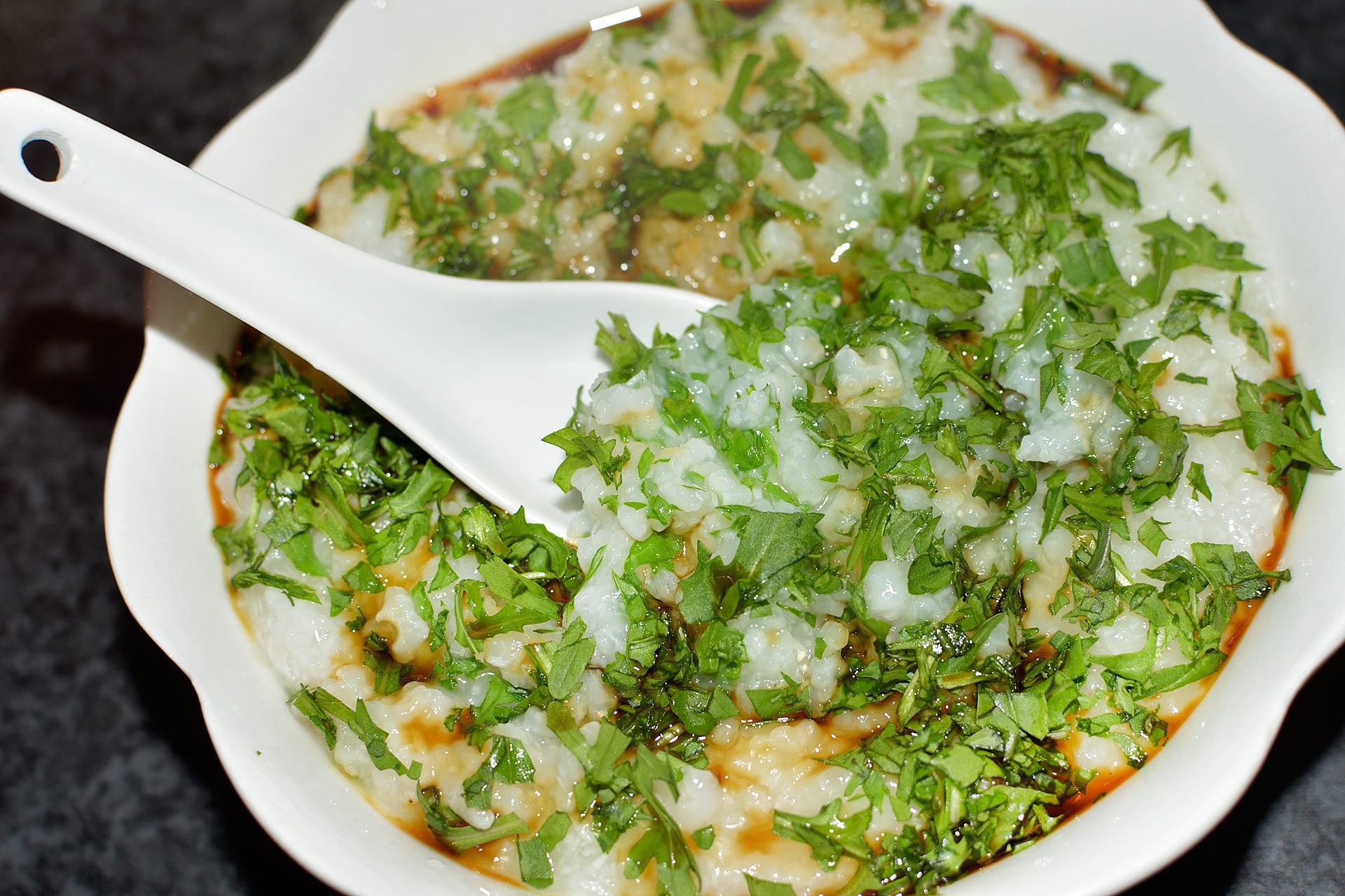 - Po uplynutí potřebné doby přimíchejte do kaše rukolu, naservírujte a pokapejte tamari.