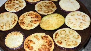 - Na suché pánvi pečte z obou stran plátky lilku a dejte stranou.