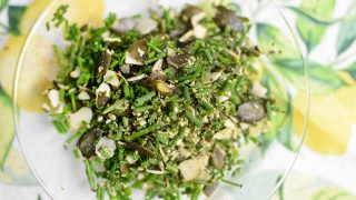 - Nasekejte pažitku s dýňovým semínkem, opepřete a promíchejte.