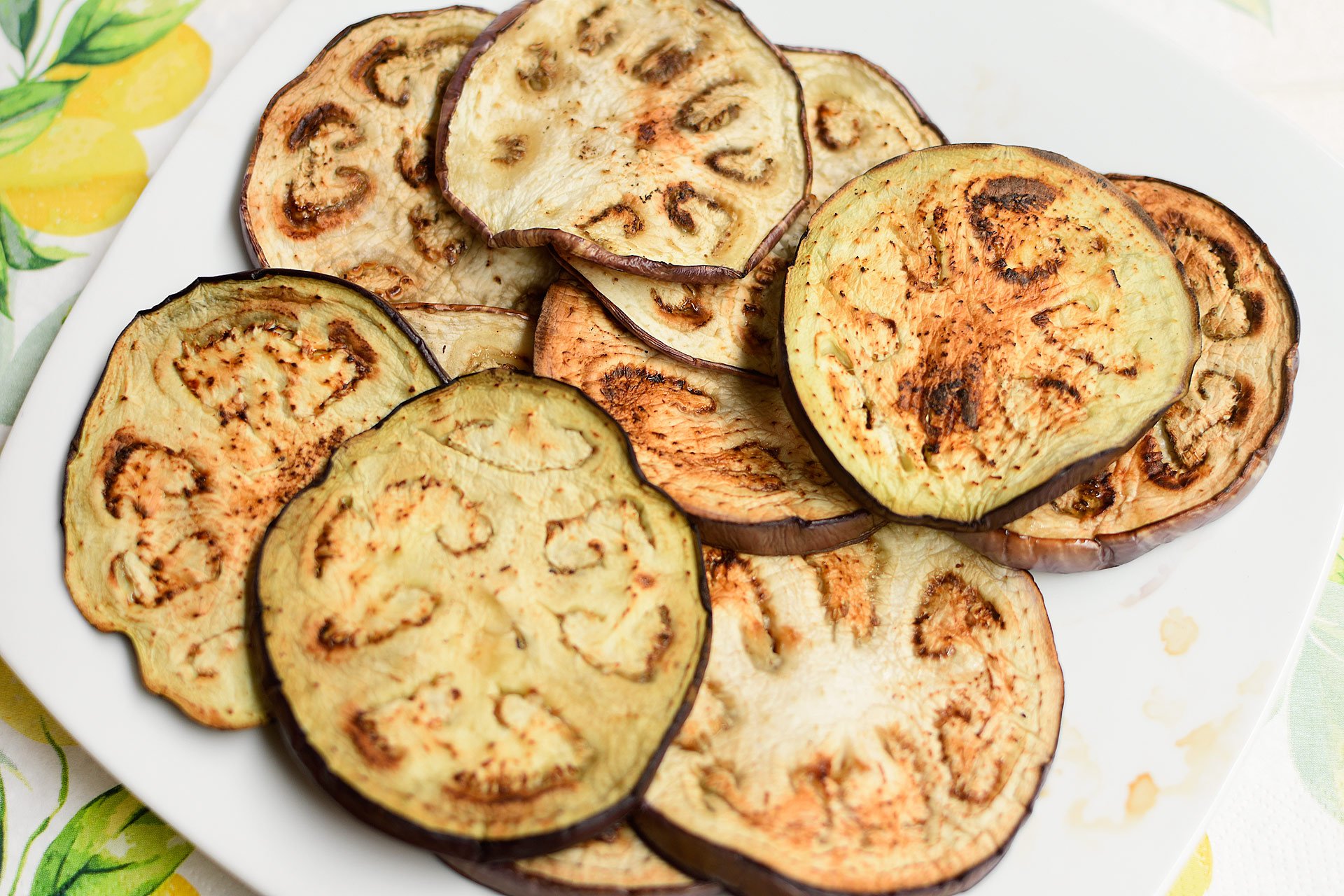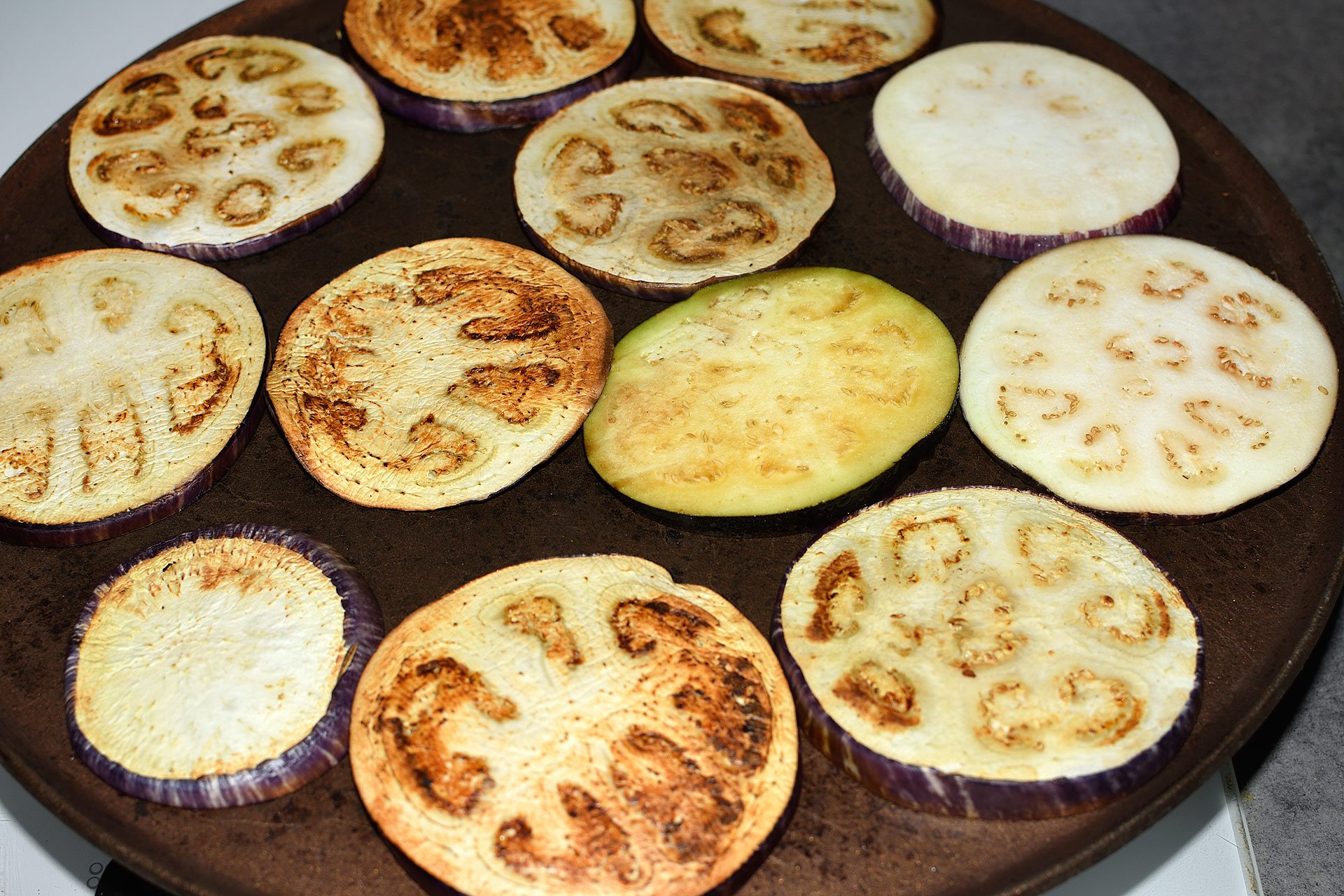 - Na suché pánvi pečte z obou stran plátky lilku a dejte stranou.