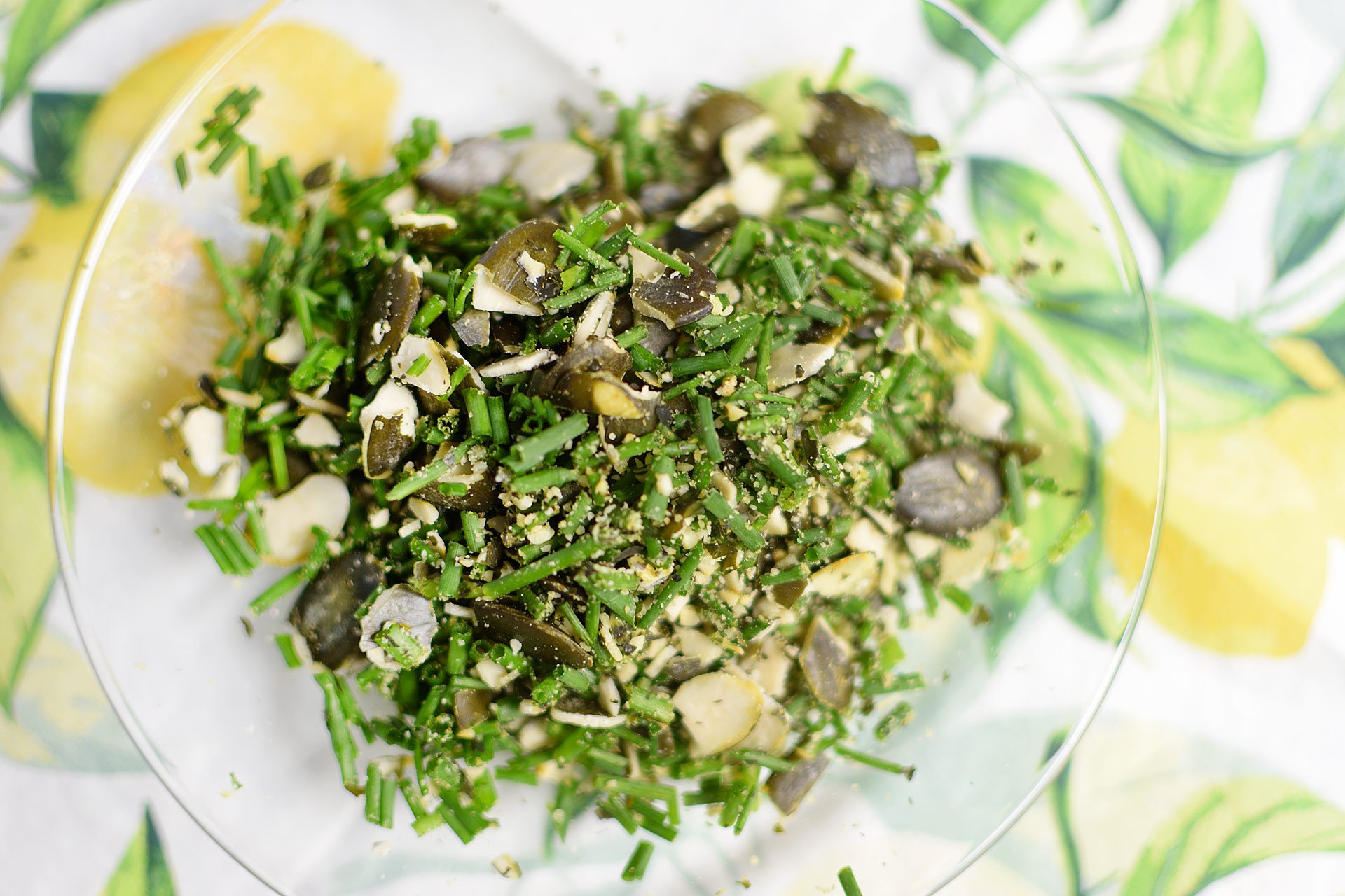 - Nasekejte pažitku s dýňovým semínkem, opepřete a promíchejte.
