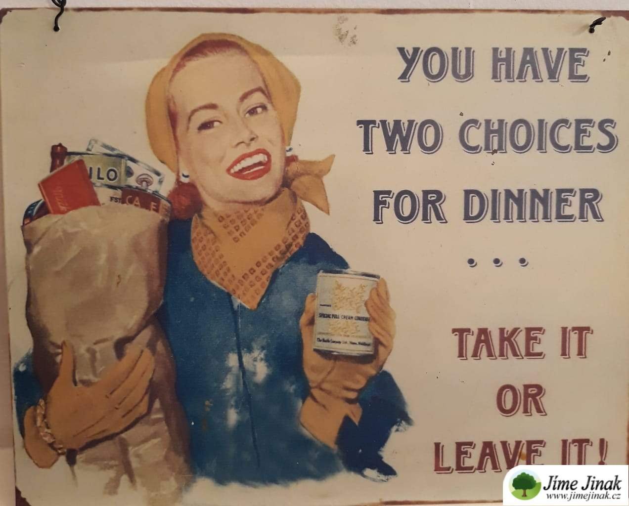 V jedné tradiční anglické čajovně jsem mezi mnoha jinými dobovými plakátky a cedulemi o pracích prostředcích a pravé kávě narazila na tuhle a hned jsem si na tu situaci vzpomněla. Cedulku jsem si vyfotila s myšlenkou na vás všechny, které vaříte víc než jedno jídlo. Co to zkusit taky tak: “Miláčku, k večeři máš dvě možnosti – ber nebo nech být.” Prošlo by to i u vás?
