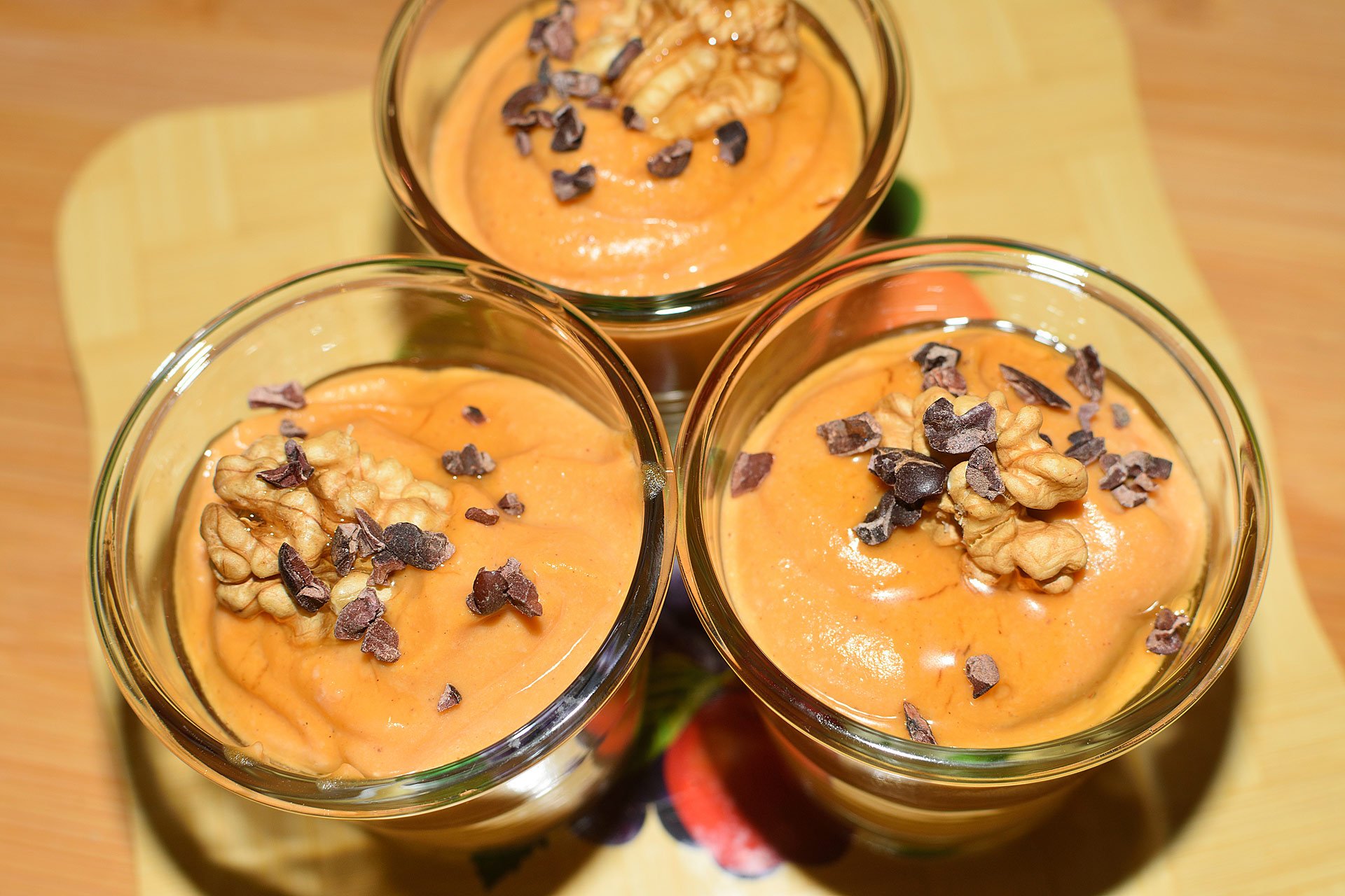 - Krém nalijte do pohárů a ozdobte povrch ořechem, troškou kakaových bobů a pro příznivce sladkého přikápněte třeba agávový sirup.