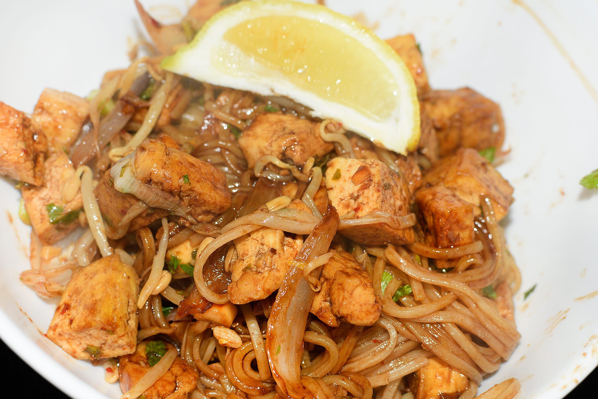 - Na pánev s tofu dejte okapané nudle, klíčky, zalijte omáčkou, zvyšte plamen a opékejte. Nakonec posypte arašídy, cibulkou a petrželkou. Můžete pokapat limetkou nebo jako v mém případě, citronem.