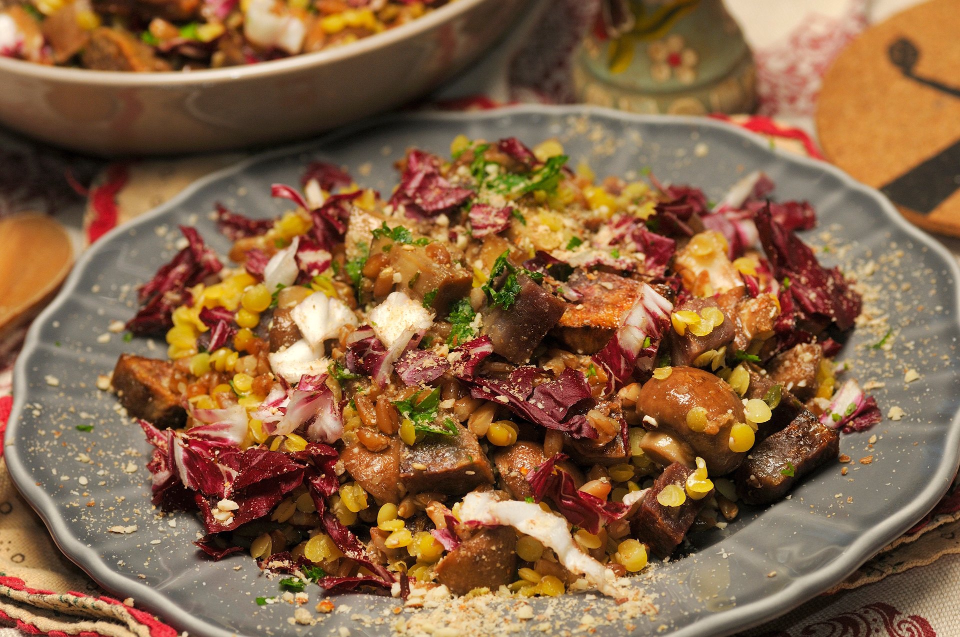 - Nakonec v jiné velké pánvi smíchejte všechno, co jste si připravili – čočku, špaldu, houby a sladký batát. Osolte, promíchejte a několik minut ještě nechte dojít. Na talíři posypejte petrželkou, červeným radicchiem a veganským parmezánem.