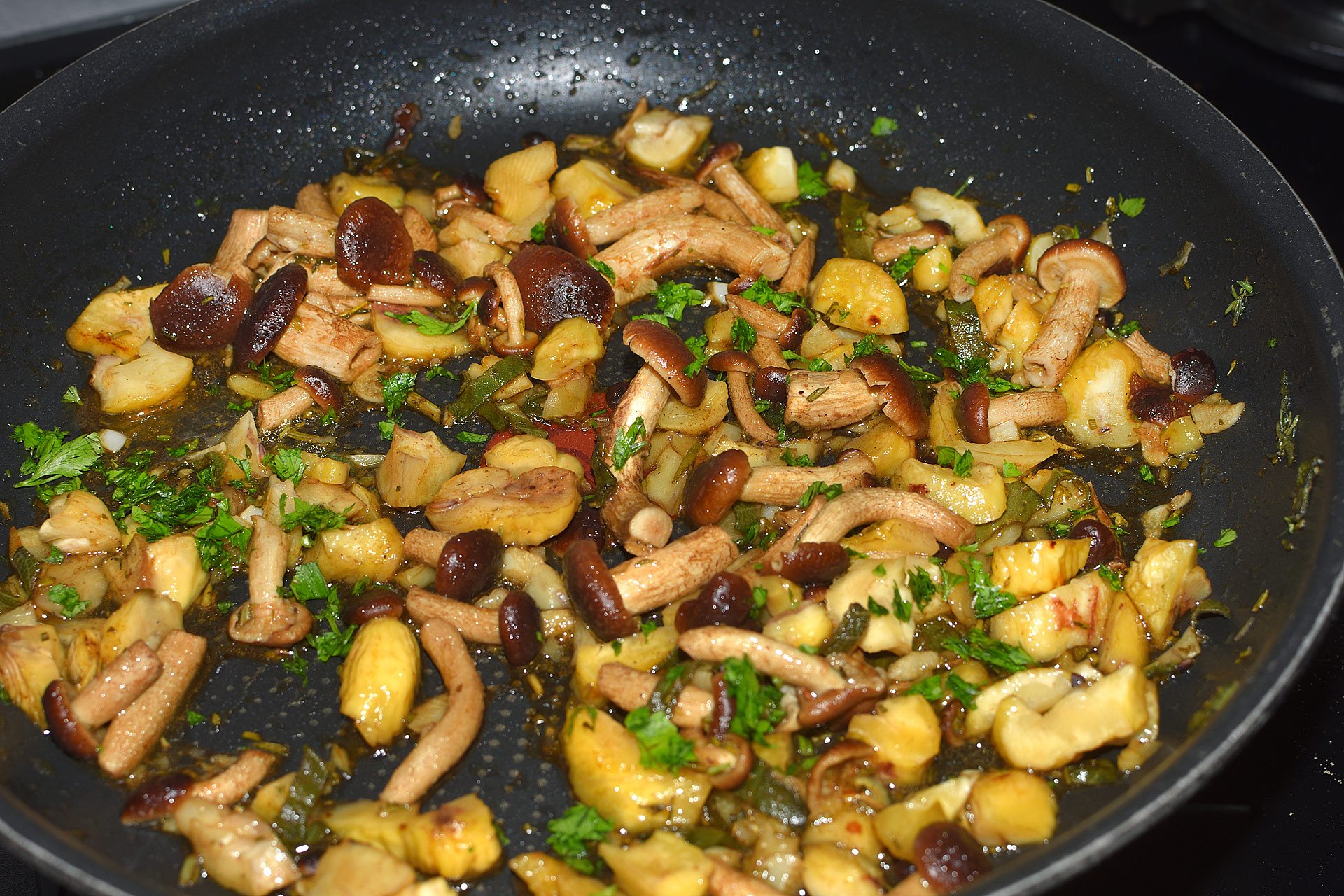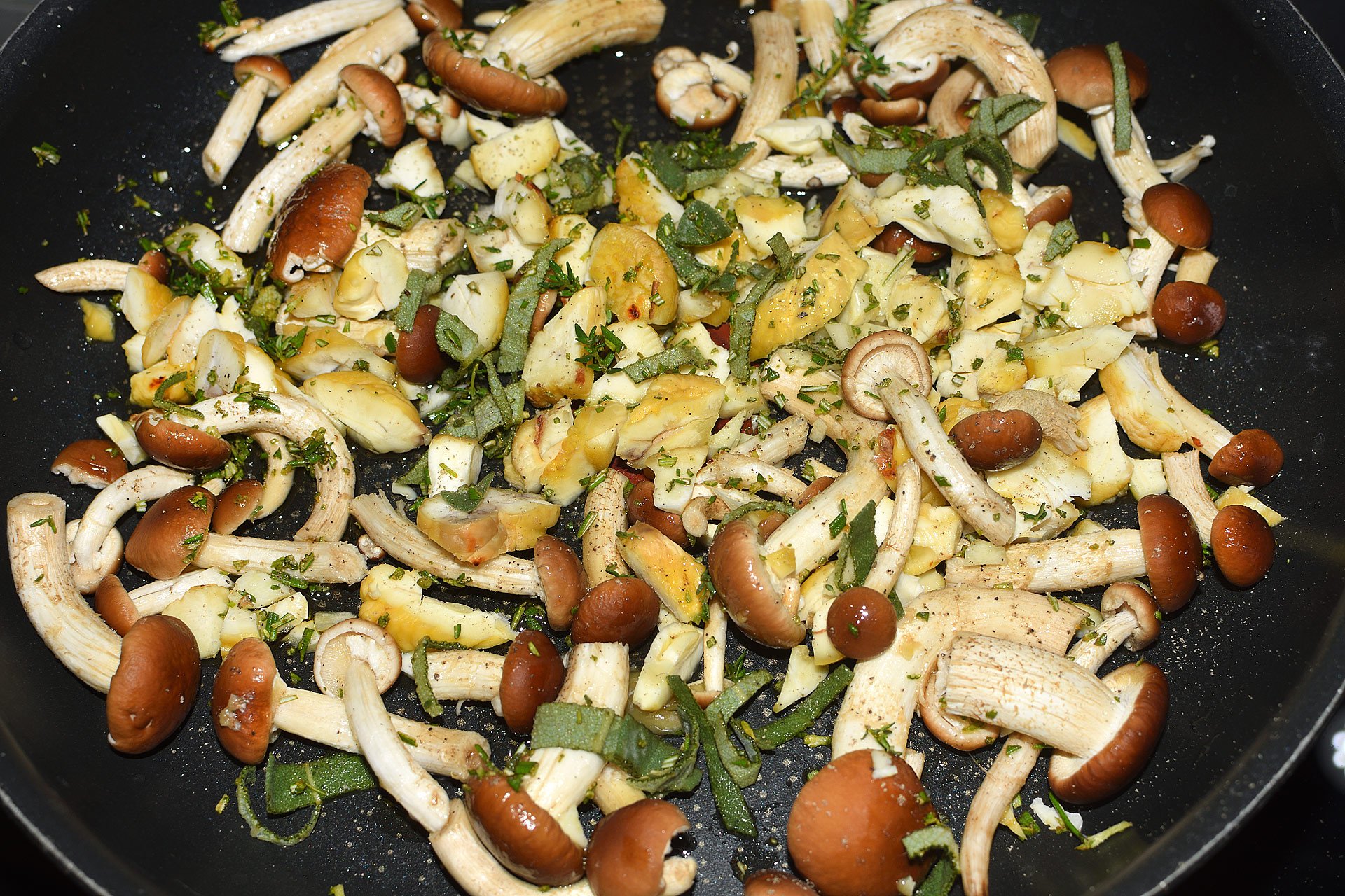 - Na pánvi rozpalte olej, přidejte jemně nasekané bylinky, prolisovaný česnek, houby a nasekané kaštany. Orestujte.