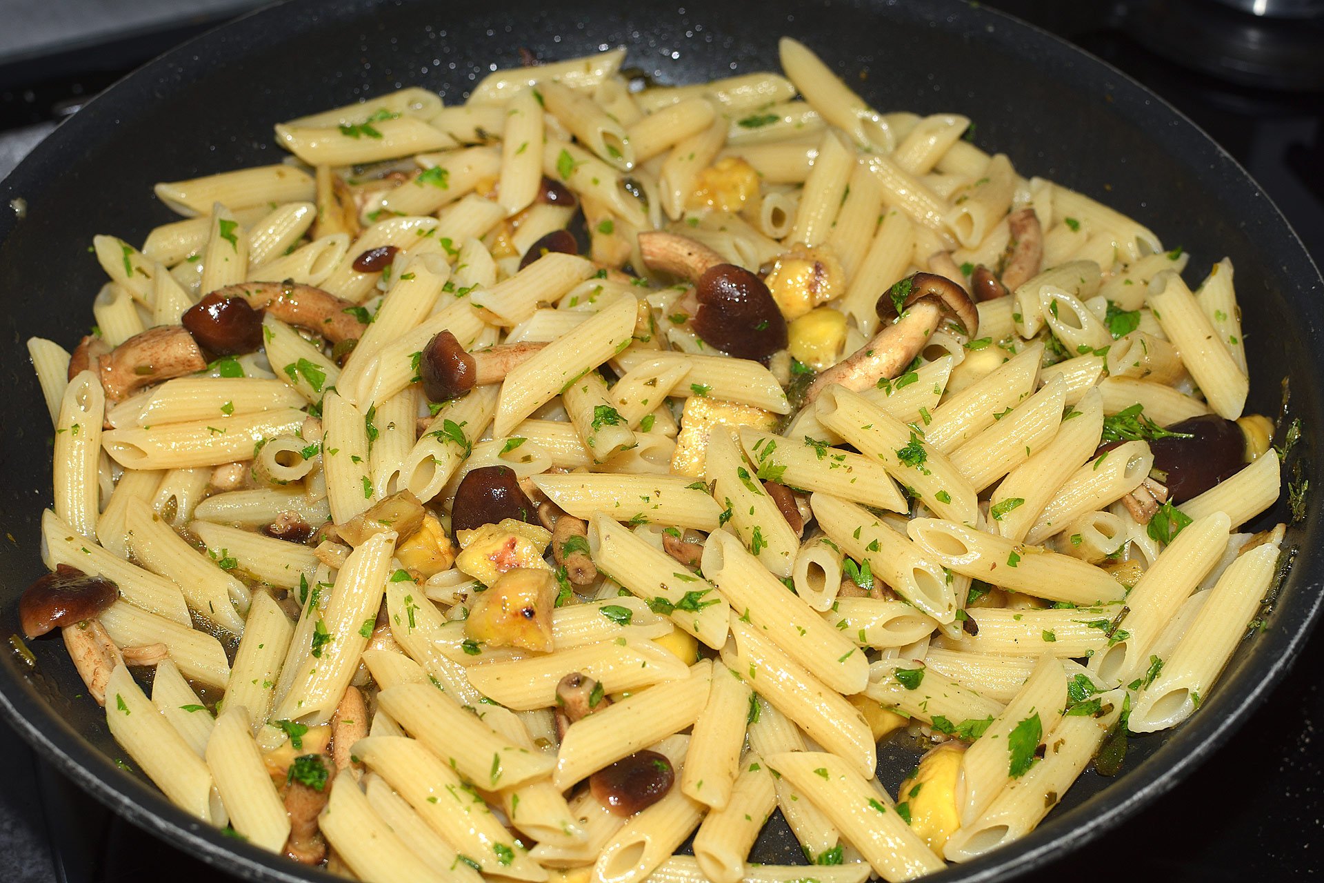 - Přidejte penne do pánve s několika lžícemi vody, ve které se vařily, promíchejte, posypejte petrželkou a vše orestujte, aby se chutě propojily.