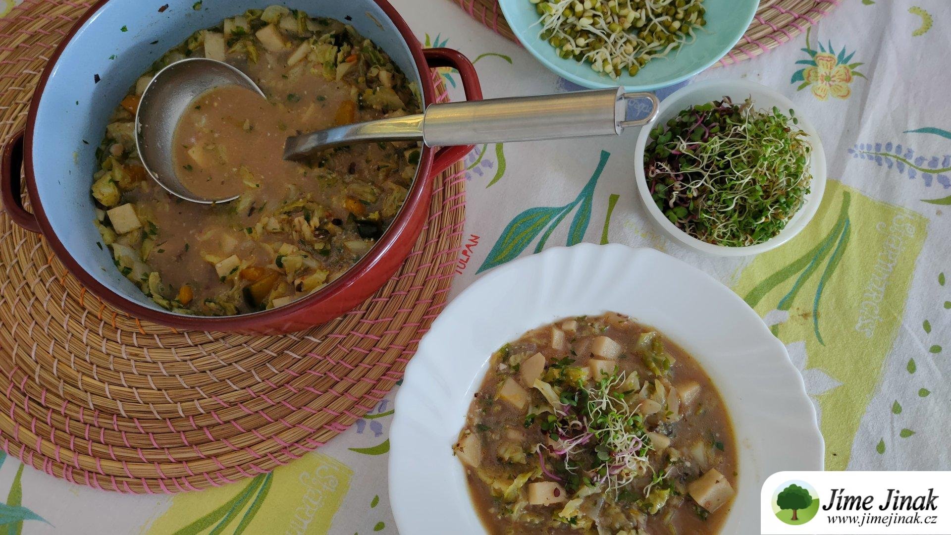 - Zalijeme horkým vývarem a vaříme cca 20 minut do změknutí zeleniny.
