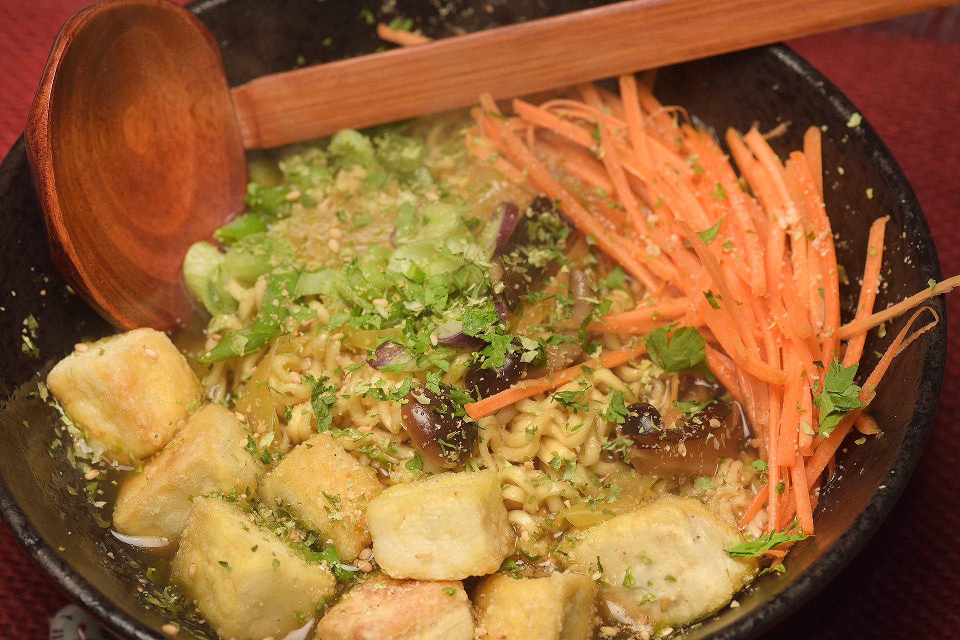 - Vyjměte sáček, přiveďte zpět k varu a přidejte nudle. Vařte 4 minuty, přidejte osmahnuté tofu, čerstvou mrkev, jarní cibulku, vločky nori, petrželku a gomasio. Hned servírujte.