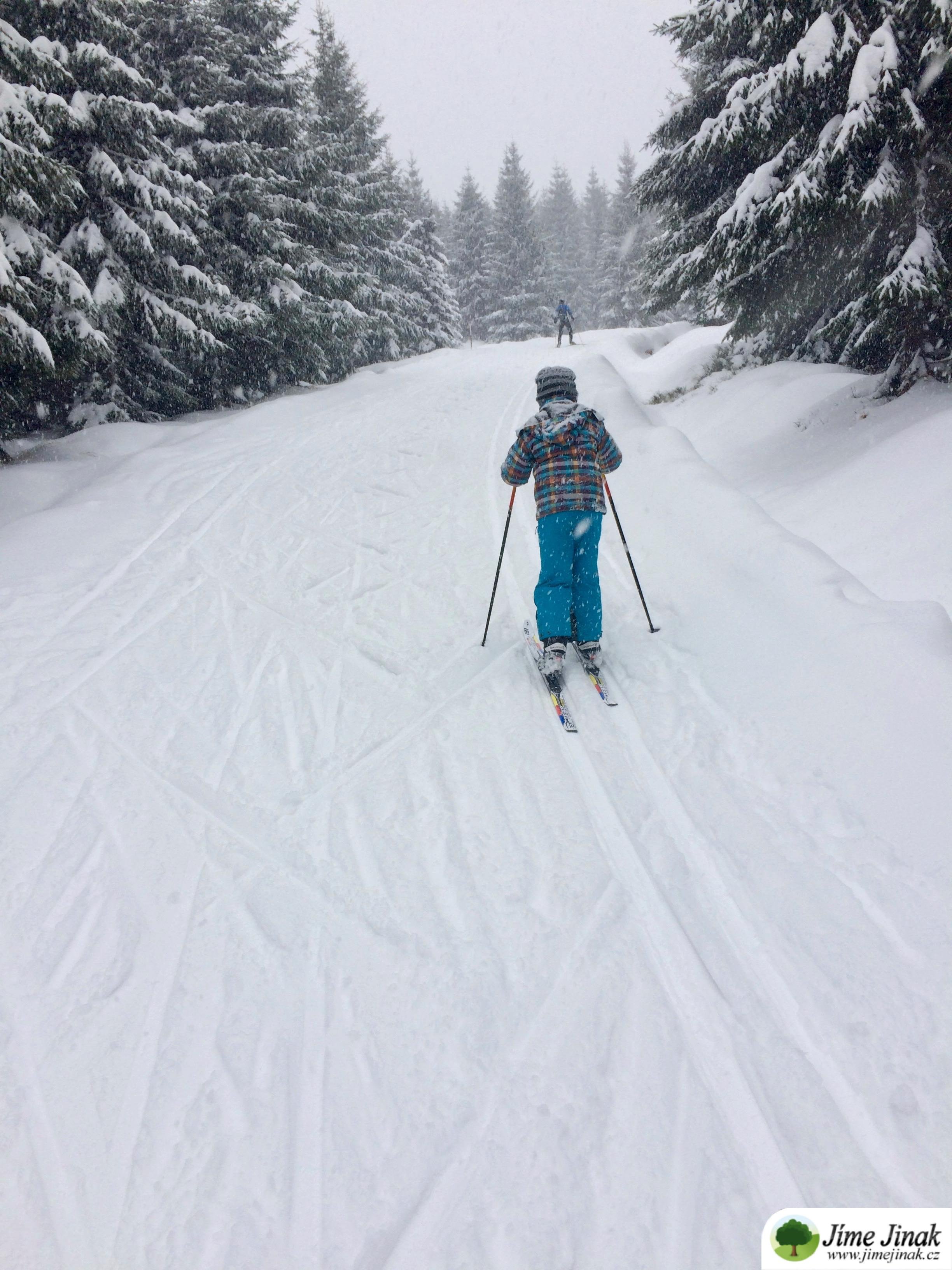 Nám se rizotem v břiše šlapalo na běžkách skvěle a ani nám nevadilo, že k autu jsme dojížděli až za tmy. Přeci jen ujet víc jak 16 km s 8-letým začátečníkem zabere nějaký čas.