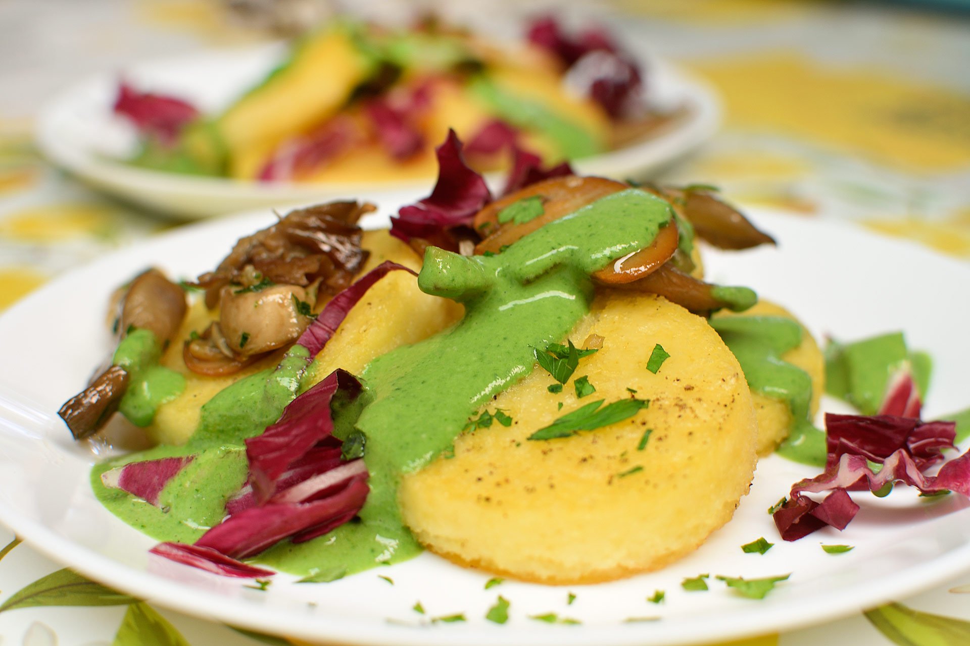 - Na talíři dejte gnocchi s houbami a dipem, posypejte červenou čekankou a petrželkou.