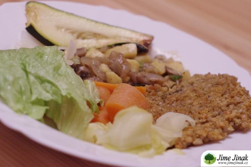 To takhle jednou zase vařil můj muž a výsledek vidíte na fotce. Přesný recept nemám, ale žampiony byly na cibuli, česneku a smíchané s polentou od oběda, kterou pokrájel na kostičky. V troubě ogriloval pro každého plátek cukety a nishime připravil z mrkve a zelí. Ze zbylé rýže uhňácal placky, které osmažil na trošce tuku. Nechyběl plátek ledového salátu a kvašené zelí. Dobrota, kterou by mě nenapadlo zkombinovat. Když jsem jásala nad talířem, řekl, že to byla jen taková rychlovka ze zbytků :-)