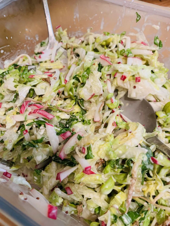 Dala jsem aquafaba majonezu domaci , pridala jsem par listu salatu a klicky slunecnicove jsem zamichala, mely korinky a ja je nechtela odkrajovat 😂
