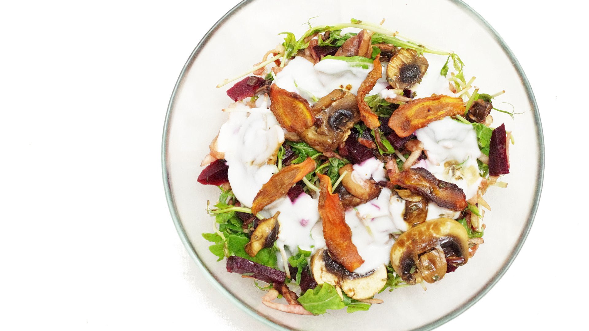 Netradiční, ale výborné spojení kokosové zálivky, řepy a marinovaných syrových žampionů. Lehoučký a chuťově výtečný salát, který se hodí jako občerstvení na letní párty nebo grilovačku.