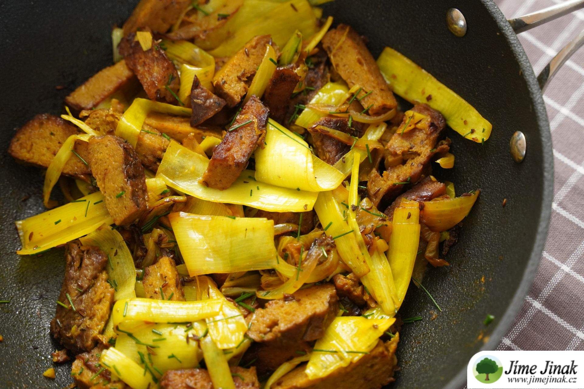 - Ve woku rozpálíme olej, vložíme pórek a seitan.