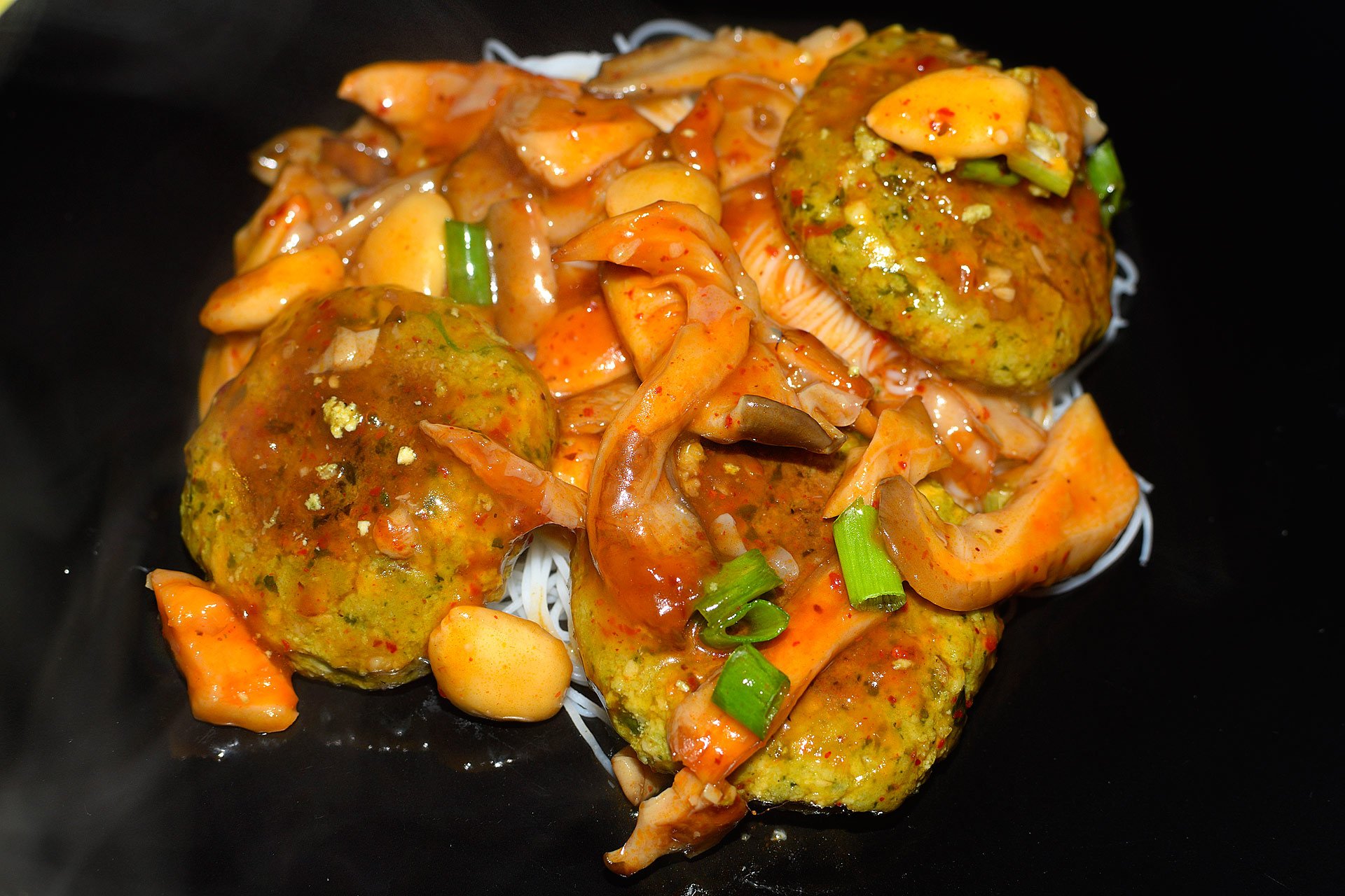 - Podávejte posypané čerstvou cibulkou. Na fotce jsou coby příloha rýžové vlasové nudle.
