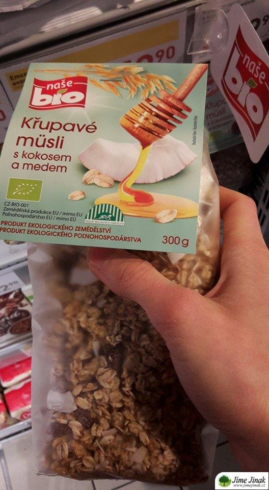 - BIO křupavé müsli s medem a kokosem (med) / s čokoládou a kokosem (třtinový cukr)