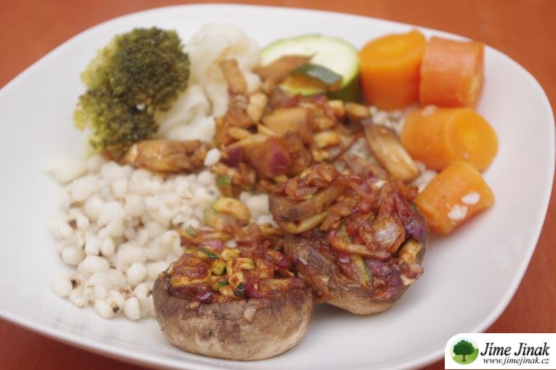 - Možná si říkáte, co s tolika zbylými nožičkami :-) Nakrájíme je na tenké plátky, vyskládáme těsně vedle sebe na plech a zakryjeme zbylou nádivkou. Během pečení žampióny pustí trochu šťávy (můžeme jim pomoc, pokud je malinko podlijeme), takže vnikne troška omáčky, kterou dozdobíme talíř.