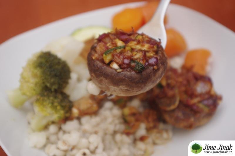 - Opatrně žampiónům vyloupneme nožky, do kloboučky dáme nádivku a položíme na plech.