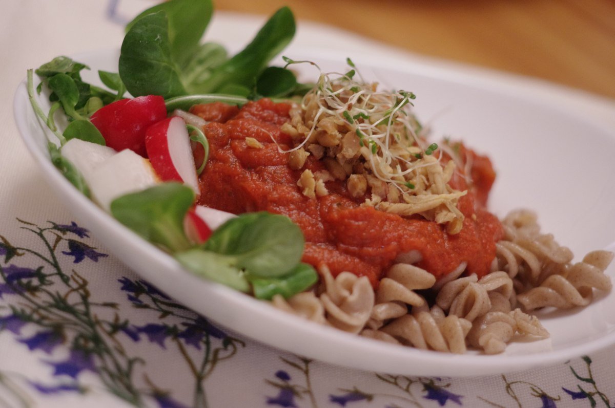 Vynikající omáčka a vůbec není poznat, že tam nejsou rajčata 🙂 Místo tempehu jsem nastrouhala uzené tofu ( víc mi připomíná chuť sýra 🙂 ) Děkujeme ❤